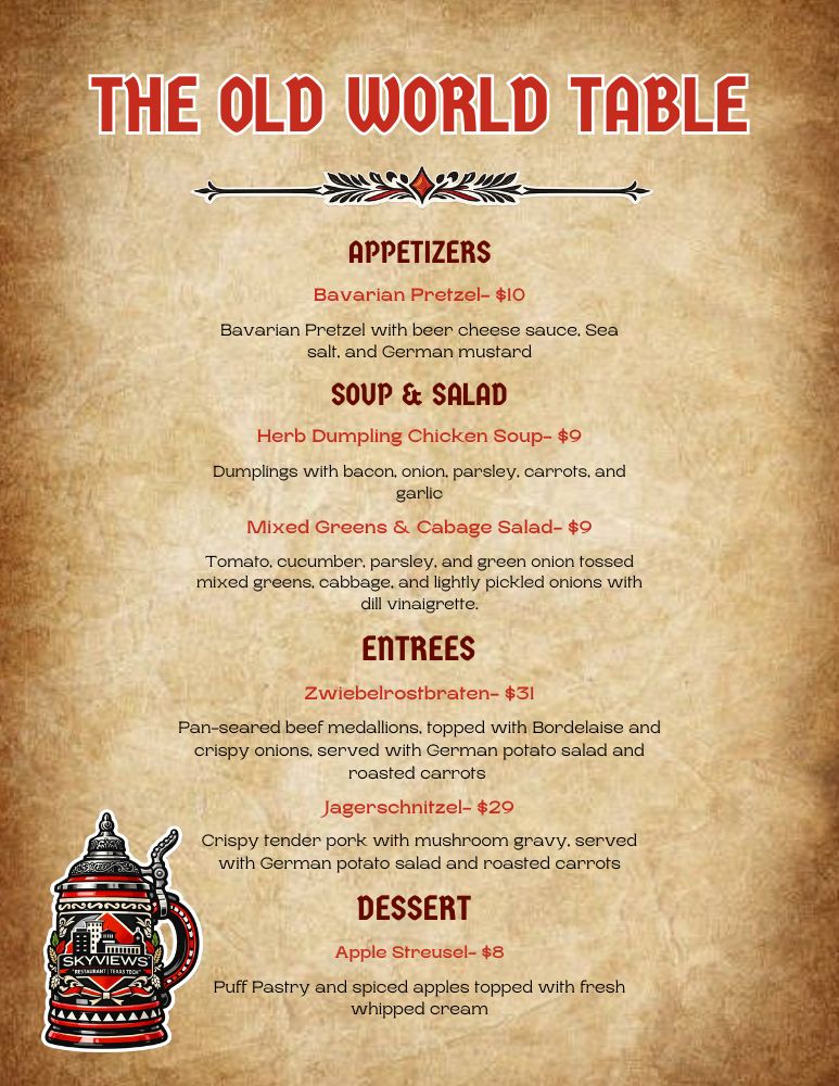 Each evening, we will be offering a themed a la carte dinner menu with a choice of starters and entrees. Skyviews Restaurant features wines by the glass, beer, and specialty cocktails.